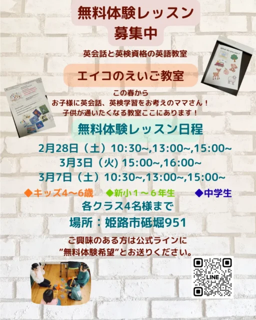 無料体験レッスン 無料体験レッスン実施中 この春から英会話、英検学習をお考えの方🌸 新規生徒募集のお知らせ 🌸こんにちは😊今まで幼児から中学生までを対象に、英語が楽しく身につくレッスンを行ってきました。小学校でも英語が必修となり、「早めに英語に慣れさせたい」「中学英語でつまずいてほ... 2026.03.03 無料体験レッスン